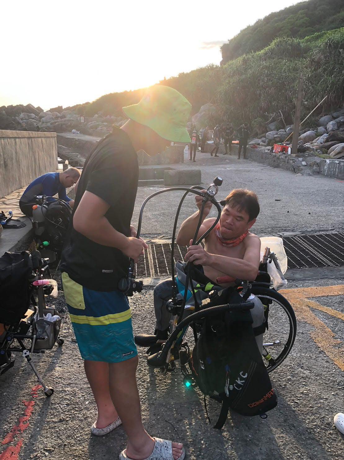 照片中,這位坐在輪椅上的朋友,正在志工的陪伴下仔細組裝潛水裝備。